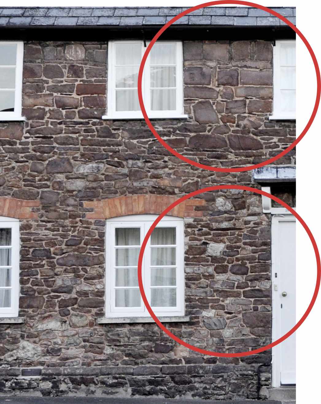 At first floor level, particularly between the windows, the